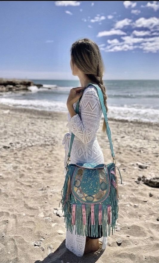 BOLSO DE PIEL INDIA ESTILO BOHO CHIC AZUL Y ROSA FUCSIA | 4 colores