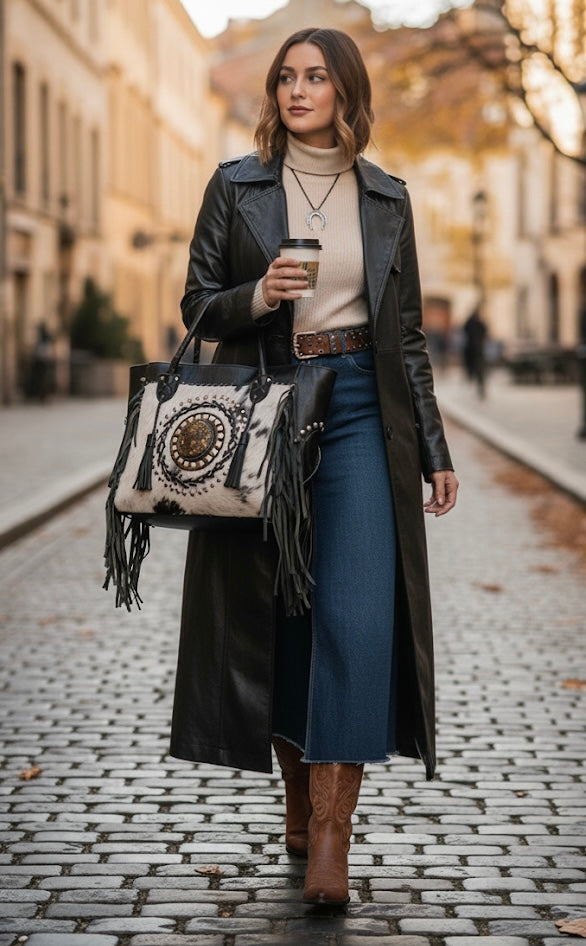 BOLSO DE PIEL CON PELO NATURAL Y FLECOS BOHO-WESTERN