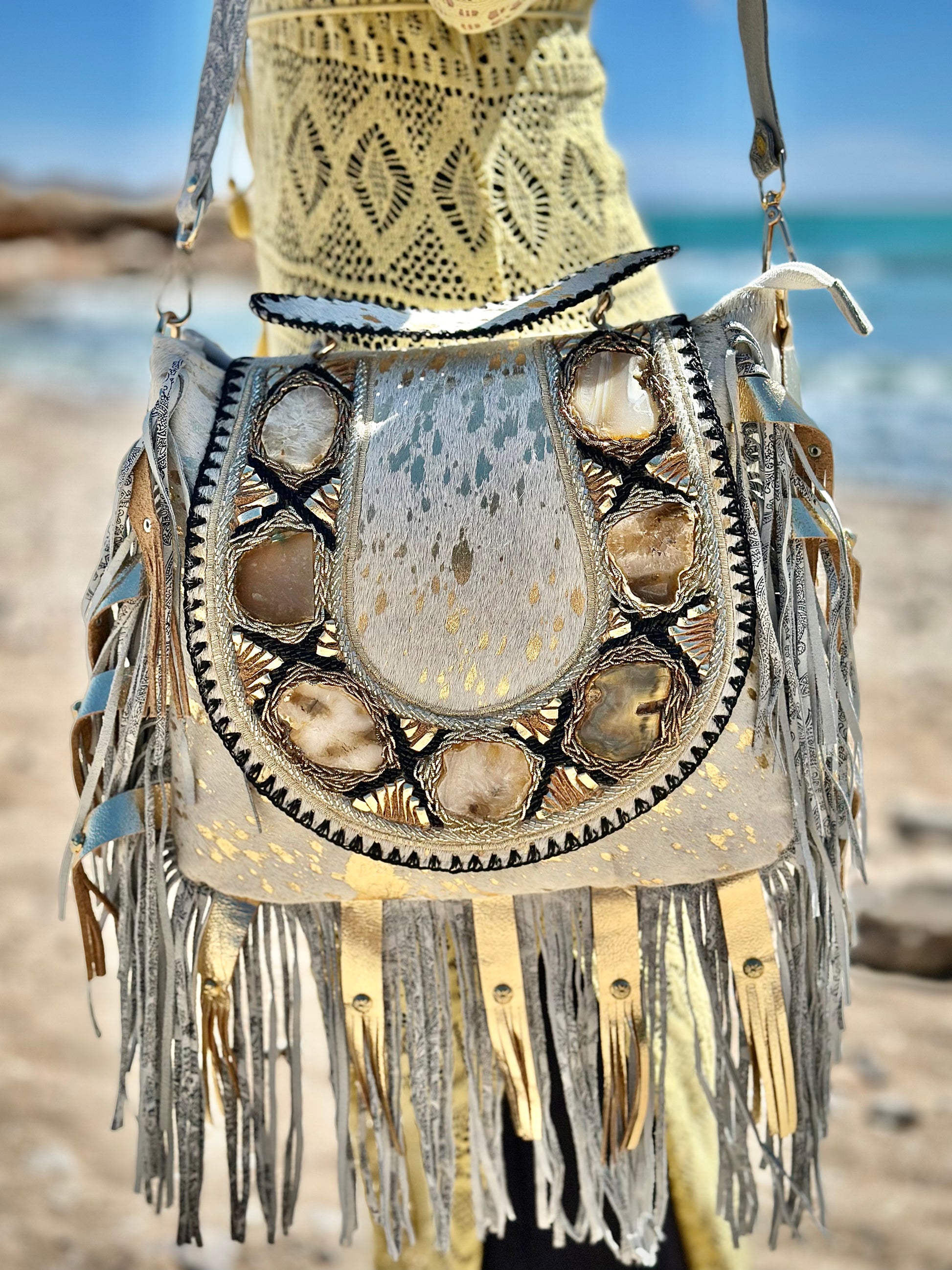 Fabriqué à partir de cuir de haute qualité décoré de détails dorés, de perles brodées à la main et de géodes, ce sac n'est pas seulement un accessoire, mais une pièce unique qui reflète le style décontracté et chic de la mode d'Ibiza. Sa taille pratique et sa conception polyvalente le rendent parfait aussi bien pour un usage quotidien que pour des occasions plus spéciales.