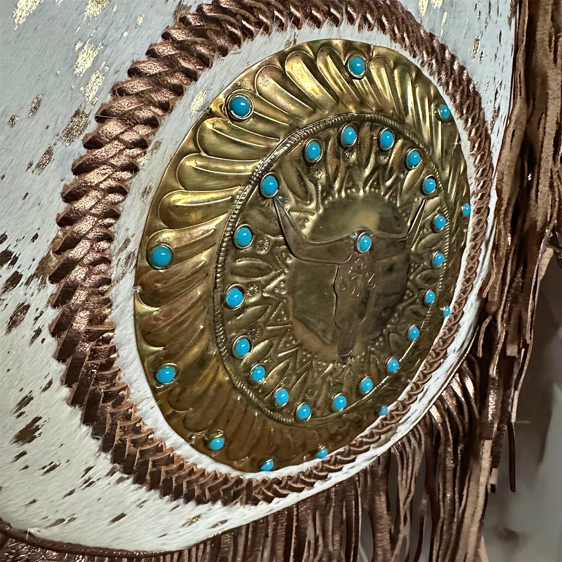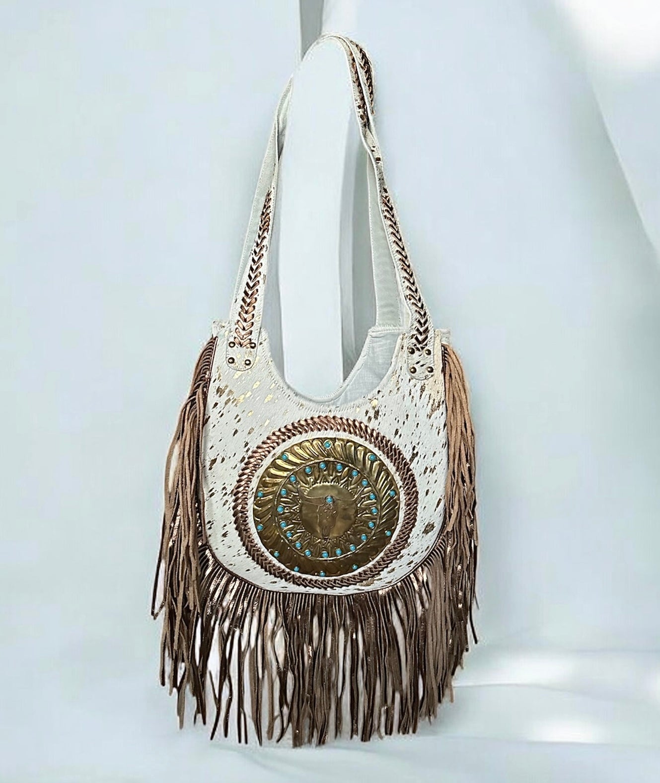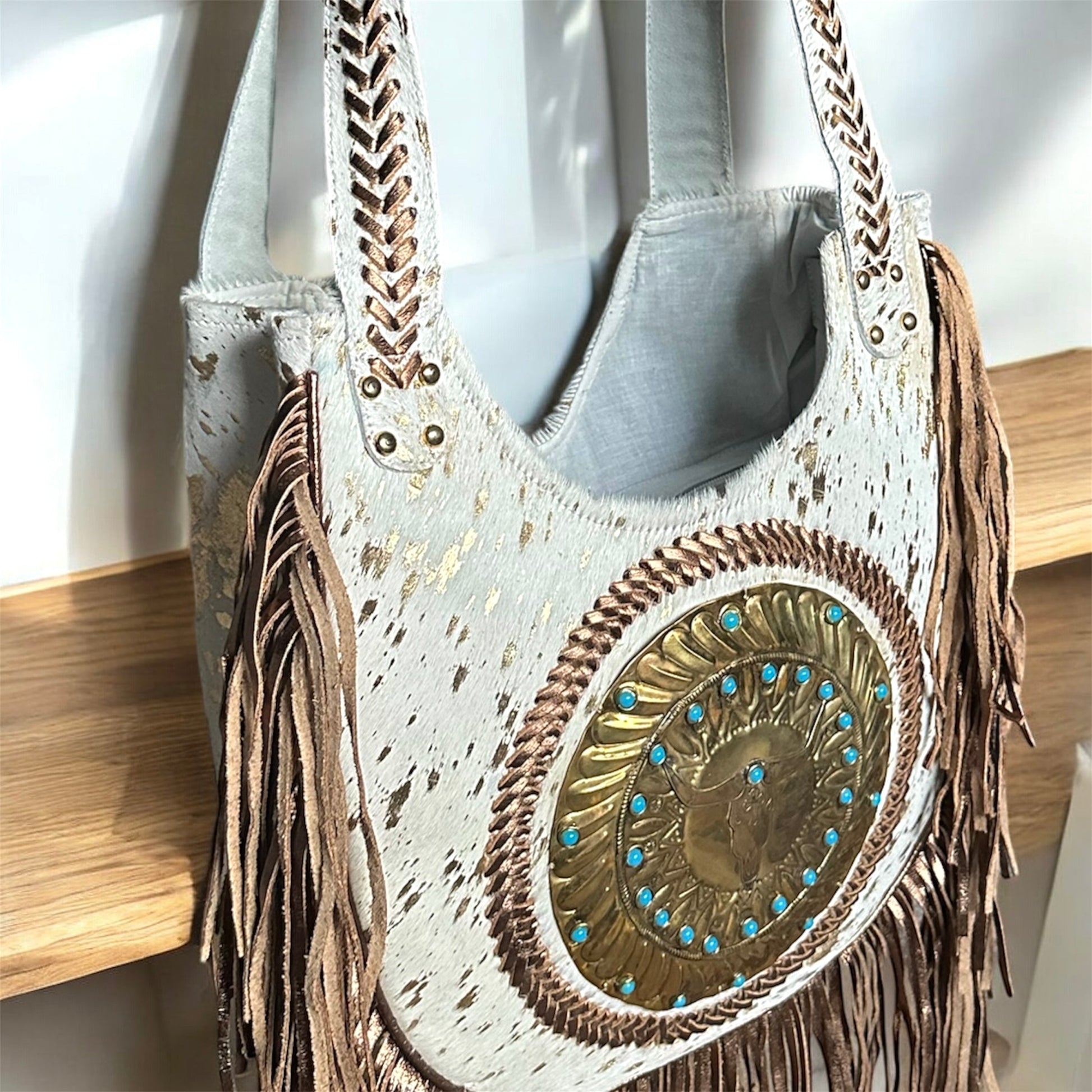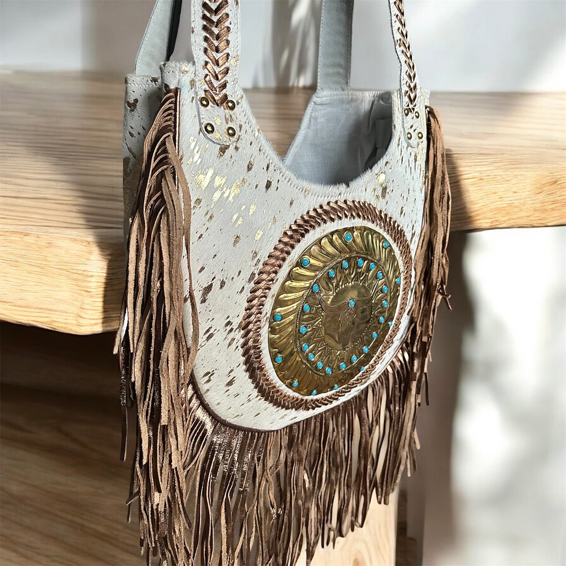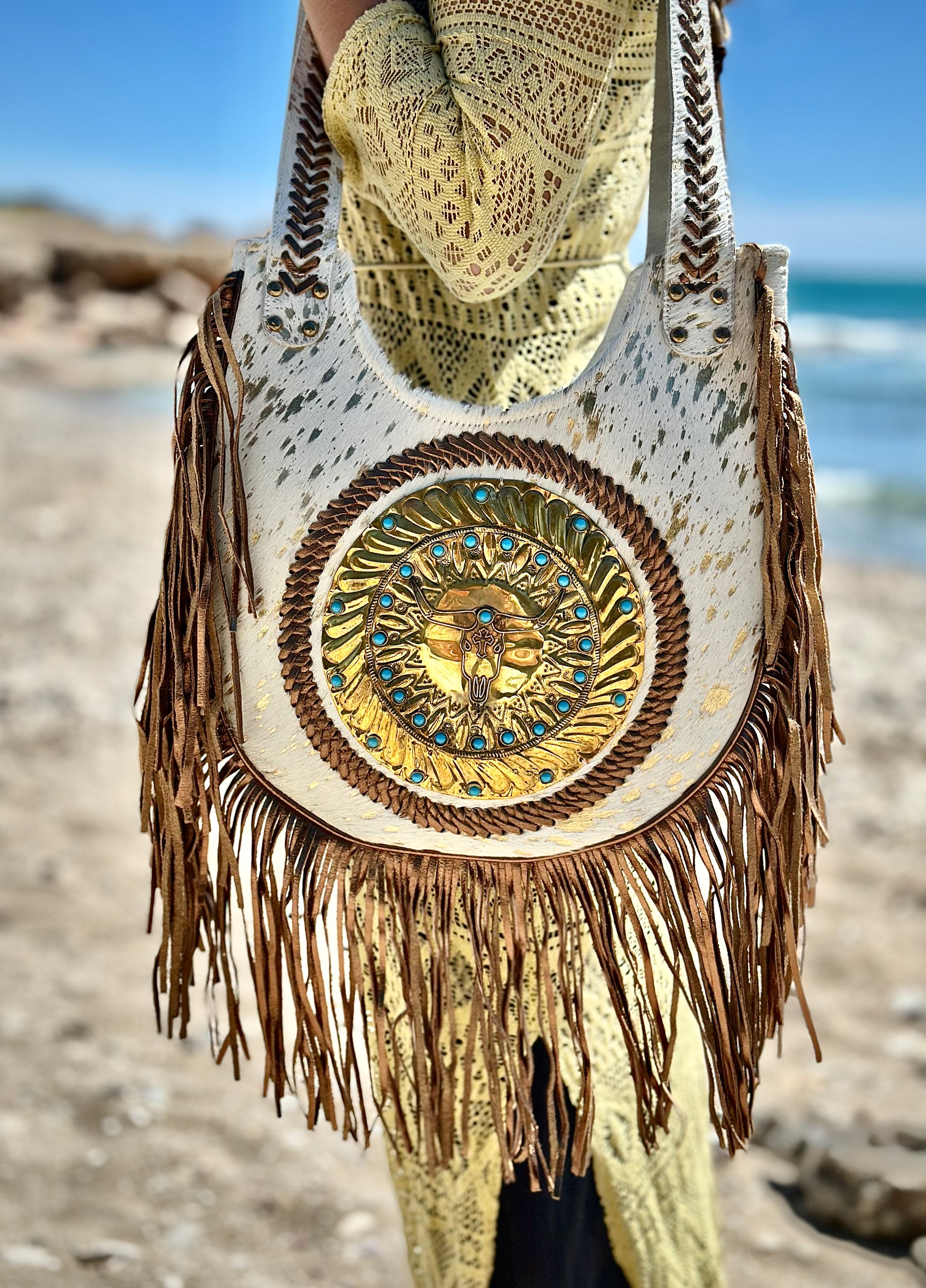 Confeccionado en piel de alta calidad y decorado con detalles tradicionales y un detalle central metálico con cabeza de búfalo, hacen que este bolso sea solo un accesorio, sino una pieza única que refleja el estilo relajado y chic de la moda ibicenca.